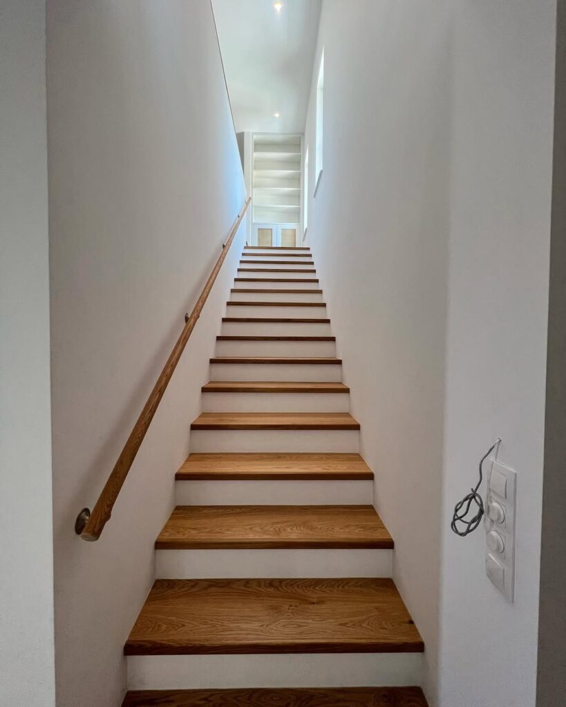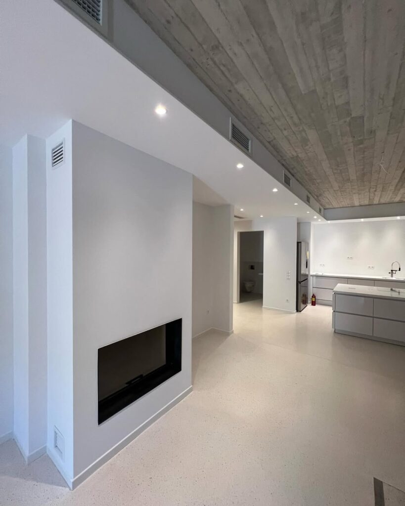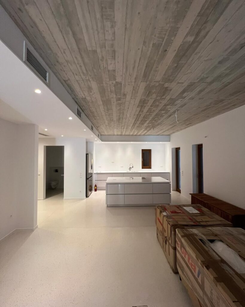 Στο εσωτερικό, κυριαρχούν οι καθαρές γραμμές, οι μεγάλες ενιαίες επιφάνειες και η ισορροπία ανάμεσα στο λευκό, το ξύλο και το εμφανές σκυρόδεμα. Η διαρρύθμιση των χώρων εξασφαλίζει εργονομία και άνεση, με το ισόγειο να φιλοξενεί τις κοινωνικές λειτουργίες και τον όροφο να οργανώνει τις ιδιωτικές ζώνες. Η συνεχής παρουσία φυσικού φωτός και η ύπαρξη οπτικών φυγών προς το εξωτερικό ενισχύουν την αίσθηση ευρυχωρίας.